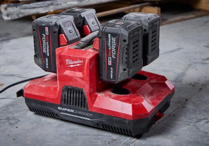 Super Chargers are Milwaukeeโs fastest chargers, and this new model benefits both M18 and M12 users. It features two M18 standalone bays and two M18/M12 hybrid bays. This allows for simultaneous charging of up to four M18 batteries, or two M18 and two M12 batteries. Milwaukee claims it charges four M18 Forge 12.0Ah batteries to 100% in as little as 90 minutes for less downtime on the job. A carrying handle, as well as Packout compatibility, make it easy to transport throughout the jobsite.