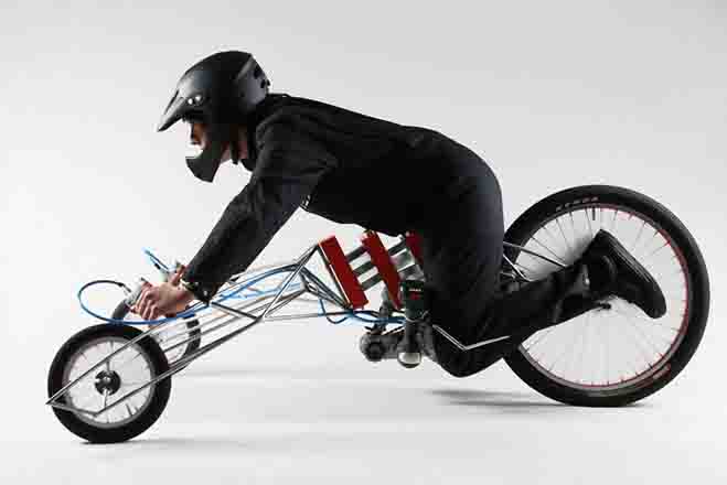 If only I had a machine shopโ€ฆ and a couple of monthsโ€ฆ and some access to fancy overrunning clutch gearwheels and a design shopโ€ฆ andโ€ฆ actually, this design might just need to go commercial, though perhaps with a bit more of a comfortable ride. With the EX tricycle, the driver is forward-facing, belly-down and drives the vehicle by actuating hand and brake triggers, the former of which control the twin 18V drill/drivers that power this beast of a machine (they used Bosch, but the system is fairly universal). With arms spread wide and torso somewhat elevated (OK, contorted) from the frame, the machine can be drivenโ€ฆ at speeds approaching 19 mph. The entire vehicle was built from scratch and modeled on the human body โ€“ a fact that is evident when you see the very spine-like exoskeleton that requires you to use your whole body to steer.