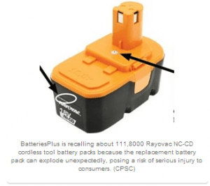 The CPSC (Consumer Product Safety Commission) has just initiated a recall of over 111,000 Rayovac NiCd Cordless Tool Battery Packs that were sold at Batteries Plus stores (both brick-and-mortar and online) due to 5 reports of unexpected explosions of the battery packs. Of course, are exploding battery packs ever expected? In either case, the reports were concerning replacement battery packs manufactured between June 2008 and October 2011 and originating in China. Exploding batteries are rare, but exploding NiCad batteries are even more rare. This is a perplexing recall that we hope will be solved soon and fortunately there have been no injuries as of yet.