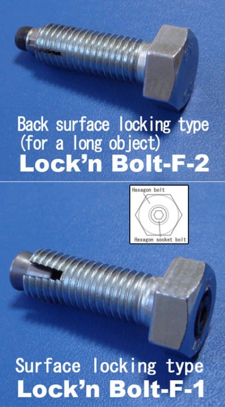 Hasegawaโs Lockโn Bolt-Fย is designed specifically for industrial and commercial applicationsย where constant vibration can eventually loosen typical nut-and-boltย configurations. Itโs the Lockโn Bolt. The Lockโn Bolt F-1 bolt has a through hole along its axis and features an inverted cone-shaped tip end with an embedded hex cap bolt that pulls the cone up, widening the end of the bolt and holding it fast within the material. The bottom end of the screw has two slits to expand the tip radially and secure it fast.