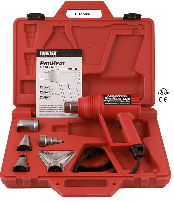 The new Master Appliance Proheat LCD Programmable Heat Gun Kit (PH-1500K) is a professional’s dream come true. If you’ve got to use a heat gun regularly, this just may be the tool you’re looking for. The PH-1500 has six preset & customizable program settings with digital display of temperature and air flow settings. Having a fully programmable heat and air flow removes the guess work out of the heating job. Now you can dial in exactly what you need, when you need it. The tool features adjustable temperature in 10 degree increments from 130 to 1000 degrees F in your choice of degrees Fahrenheit or Celsius. The air flow is even adjustable from 4 to 16 CFM (113 – 453 l/min.)