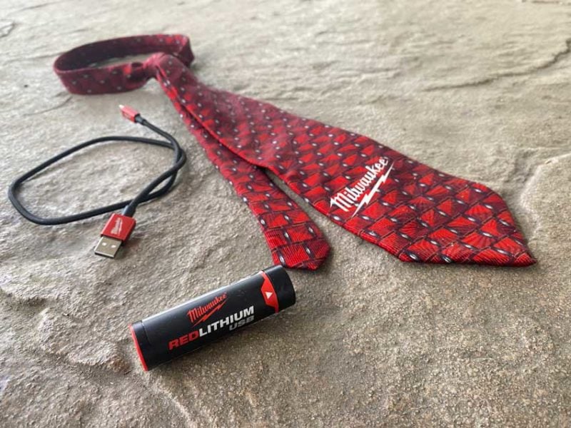 The new necktie comes as a kit with a Milwaukee RedLithium USB battery and charger. The heated tie kit runs just $129 and comes in Red, Black, and Camo. Wear it as a normal tie, or activate the integrated USB battery and wrap it around your neck for extra warmth. It works great while working on the job site, hunting for game, or even ice fishing. Similar to the companyโ€™s USB Heated gloves, the Milwaukee RedLithium USB Heated Tie delivers up to 6 hours of run-time on a single charge.