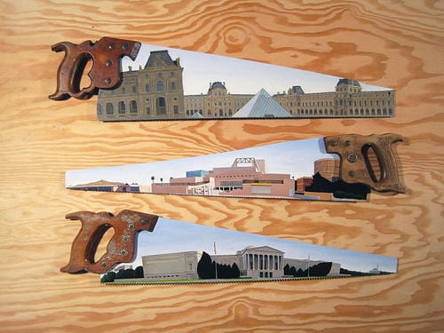 Apparently, saw blade paintings go way back to the 1700s, around the same time folk art was popular on pieces of tin or other metal. It was a form of art related to, or even part of, something called tole painting. Tole painting took folk art back to its roots by taking place on tin and wooden utensils, household objects and furniture. This was real detailed stuff, transforming ordinary objects like utensils, coffee pots, tables, chairs, etc into small works of art. Rico Solinas is famous for applying this form of art to saw-blades (which we found to be particularly cool). His work is actually on display at the ASU Art Museum in Arizona. He has a collection called “100 Museums: Paintings of Buildings That Have Paintings Inside” which is made up of architectural portraits painted on old hand saws. It’s beautiful stuff and something to be enjoyed.