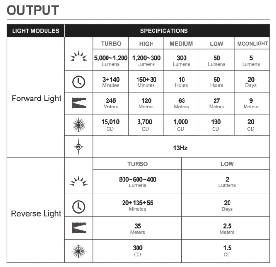 For instance, on Turbo, the light will produce 5,000 lumens for about 3 minutes and then automatically back down to 1,200 lumens and run for an additional 140 minutes. This leads to some slightly complicated runtime estimates, but with that knowledge in mind, it gets a little easier to understand.