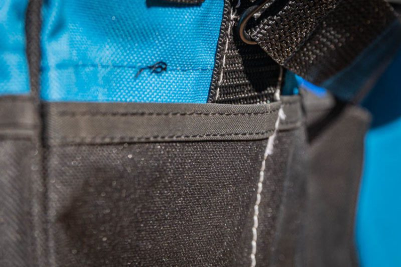 The bag is held together with a combination of single and double stitching. Around the top, thereโ€™s a metal insert sewn in that offers some rigidity and helps the top stay wide open. The bottom has a base thatโ€™s somewhat flexible while stiff enough to add rigidity there as well.