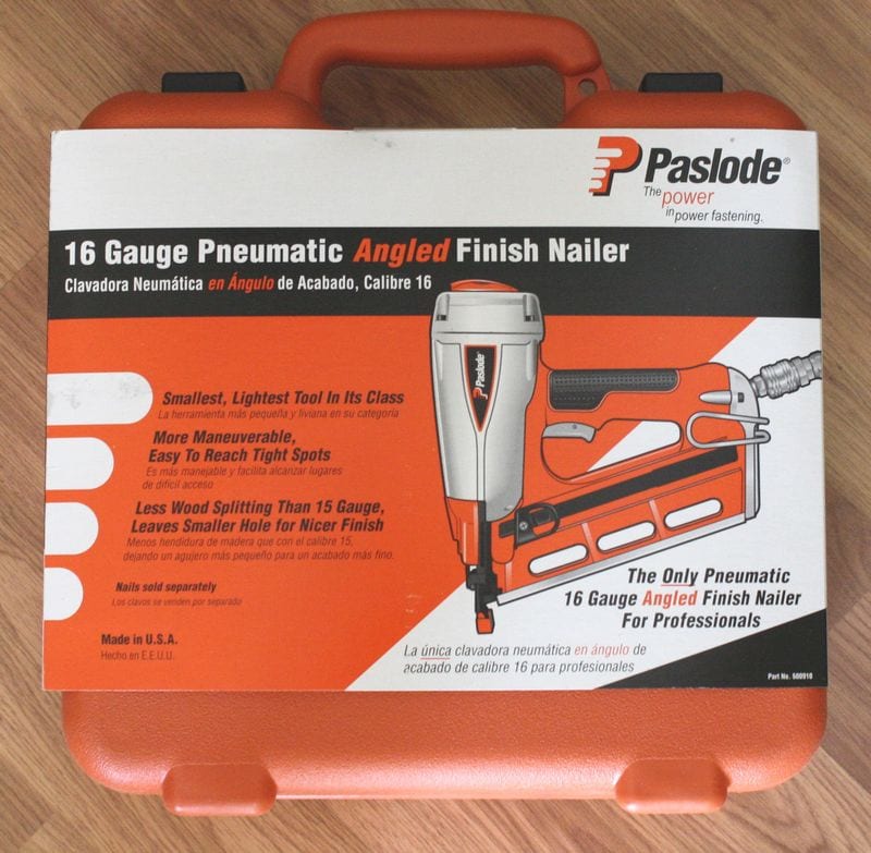 When the Paslode T250A-F16 16-Gauge Angled Finish Air Nailer arrived at our testing facility, it came in a tough blow-molded, orange colored hard case. Inside the case came the nailer, extra no-mar tips, safety glasses, single fire mode trigger, and the ownerโs manual. There is even some space inside the case for two or three boxes of Paslode fasteners. Just to make sure that we used the correct nails for this trim nailer, the folks at Paslode kindly included some 1-1/4โณ and 2-1/2โณ smooth shank galvanized trim nails.