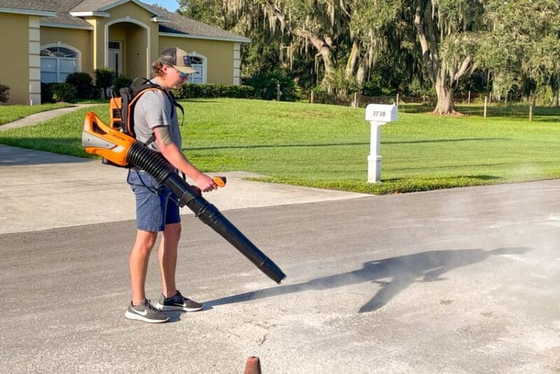 Obviously, thereโs no pull cord or choke you need to fight with to get the blower started. All the controls are literally at your fingertips while youโre wearing the blower. You start by pressing the power button on the trigger interface and hitting the trigger once to activate the unit.