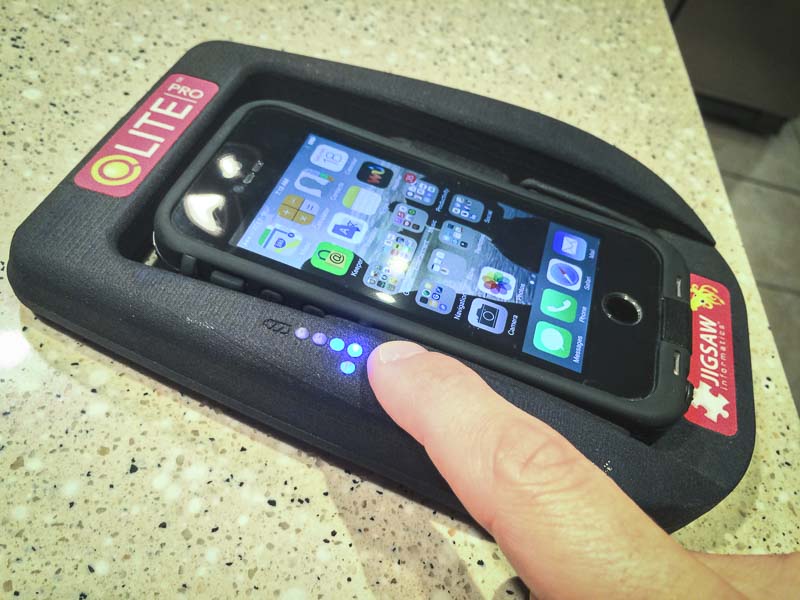 You can operate the QLite Pro Smartphone LED Floodlight in either low or high modes, and there are blue LEDs (four of them) to indicate the battery level remaining for floodlight use or phone charging. Our sample was a nylon-based 3D printed model, but the final will be made from ABS plastic, giving it even more durability and a smoother finish. One of the stretch goals of Jigsaw Informatics is to deliver a rubberized sleeve for the QLite Pro, making it an even more durable product.