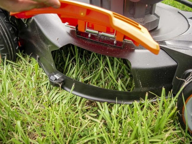 The self-propelled Redback 120V lawn mower uses a single point height adjustment. It ramps up the convenience factor since you donโ€™t have to go around to each separate wheel and set the height four different times.