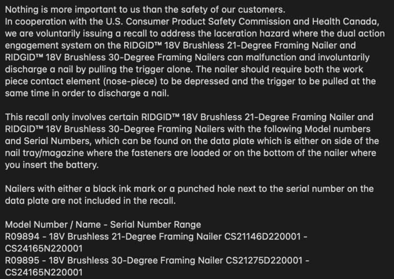 Ridgid put out a statement regarding this recall on their social media channels. Here’s how the brand acknowledged the issue: