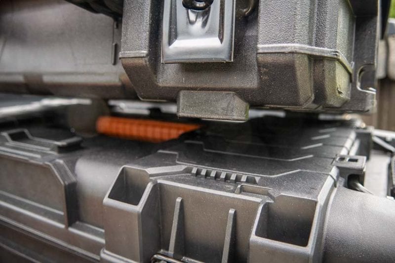 The Ridgid Mobile Job Box is part of the brandโs modular tool storage system designed to stack and lock together. Because of that, itโs important that this box has strong connection points for locking. In our experience, the boxes nest well into each other and then lock down together securely with latches that donโt unexpectedly come undone on us.