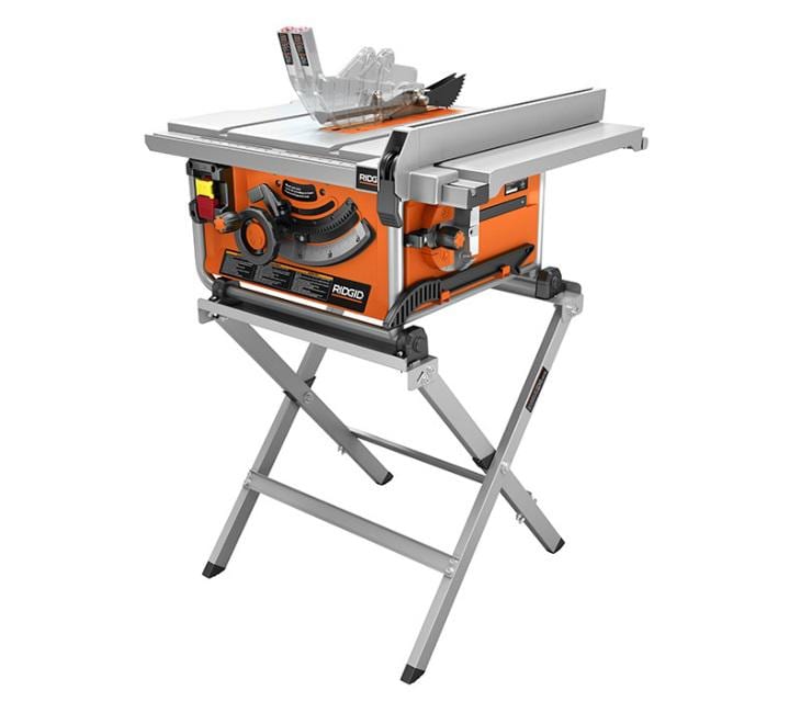 This saw comes with a compact folding stand as well. The stand elevates the saw to a comfortable working height and folds easily for compact transport and storage. Ridgid constructs the table and stand from rugged cast aluminum, and the table saw includes a steel roll cage for added durability.