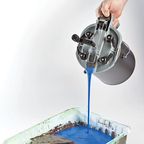 Each Mixing Mate Paint Lid features four cam locks that create a tight seal to the can, eliminating spills. After the lid is locked, you just crank the handle clockwise for about 30 seconds to completely mix the paint or finish (itโs fine for stains as well). The integrated pouring handle looks to be made very well, and itโs easy to grip. A spring-loaded thumb trigger means that you can pour your paint accurately and quickly with just one hand (think โmaple syrup dispenserโ). The pour spout/trigger mechanism is spring-loaded, so itย seals itself when youโre done and you can store the unused can as-is.