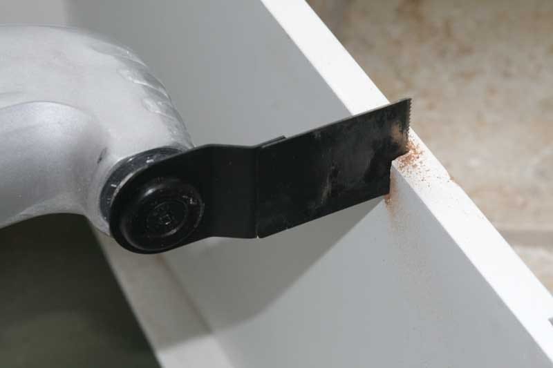 For a piece of simple pine or on baseboard material it will likely do just fine. In fact, we just so happened to have a project that required a couple notches be cut into a piece of particle board in order to properly mount some file folder hangers in a drawer. Taking the Rockwell SoniCrafter we were able to plunge cut our notches and complete the task in no time flat. Cutting two blade widths right next to each other would be impossible for a rotary tool, but the oscillating motion of this device made it easy to simply plunge cut and then start another cut immediately adjacent to our starting position.