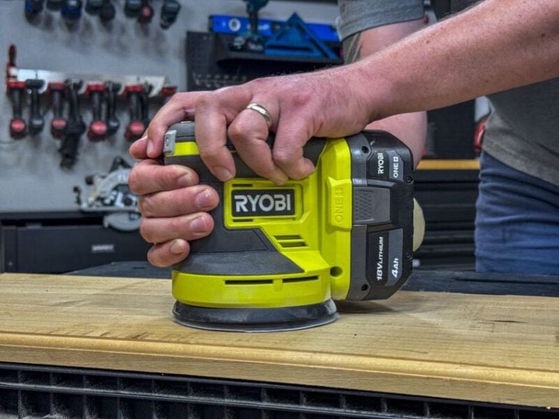 To us, the Ryobi random orbit sander is a big step up from their previous corded model. In spite of losing some speed, this cordless sander is very effective and easy to use. Itโs perfect for one-handed use but isnโt so small that you canโt use a second hand when you need a little more finesse. If youโre looking to phase out your older corded sander, this is a great option thatโs easy on the hand and your wallet.
