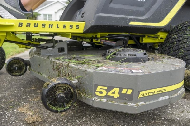 One of the things that set Ryobiโs ZT apart from the competition is its 54-inch deck. With the decks on EGO and Greenworksโ models stopping at 42 inches, the extra 12 inches is helpful when you have a larger property that you want to finish mowing more efficiently.