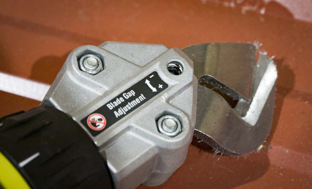 Thereโs a bit of a learning curve if youโre new to using a cordless metal shear. You have a jaw adjustment that youโll want to dial in before you start making your primary cuts. The jaws come set for thicker gauges, and we had to adjust it for the 26-gauge metal roofing we were working on.