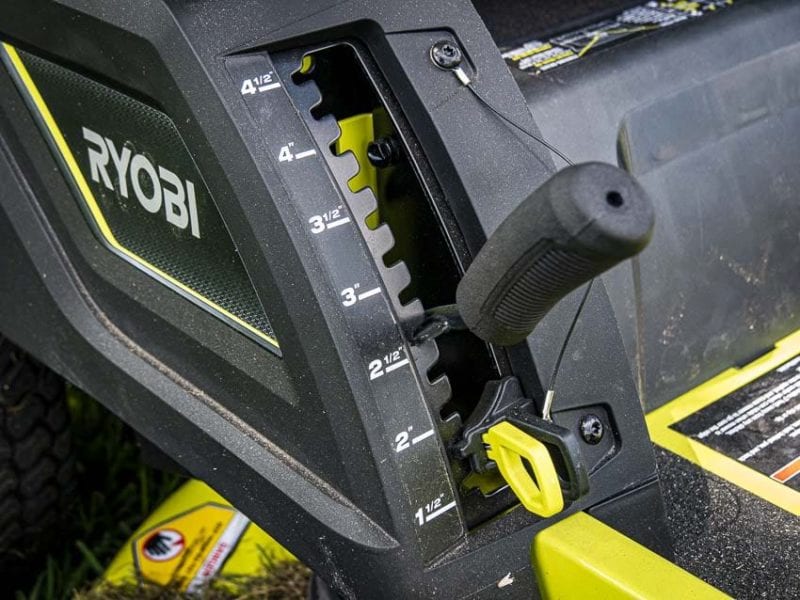 Both the deck height and seat on the Ryobi Zero Turn Mower are super simple to adjust. In the case of the seat, youโve got your standard under-seat lever to control the 4-point seat adjustment. As far as the deck height adjustment goes, I generally prefer a foot-controlled lift. However, the deck on this mower isnโt particularly heavy, and itโs easy to set the height in any 1/4โณ increments between 1-1/2โณ and 4-1/2โณ.
