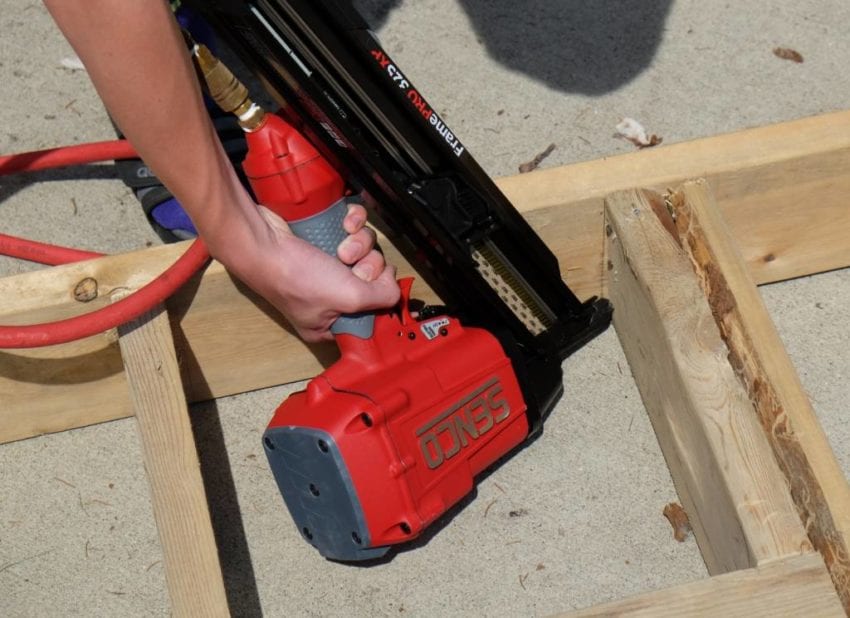 Pros know that using a framing nailer all day requires a well balanced and ergonomically sound tool. When youโre working around on ground level builds like these, a lack of attention to the ergonomics willย leave you with sore muscles and joints by lunchtime. The constant reaching up and around vertical builds will do the same. Fortunately, the Senco FramePro 325FRHXP offeredย greatย balance andย I really liked theย comfortable textured grip.