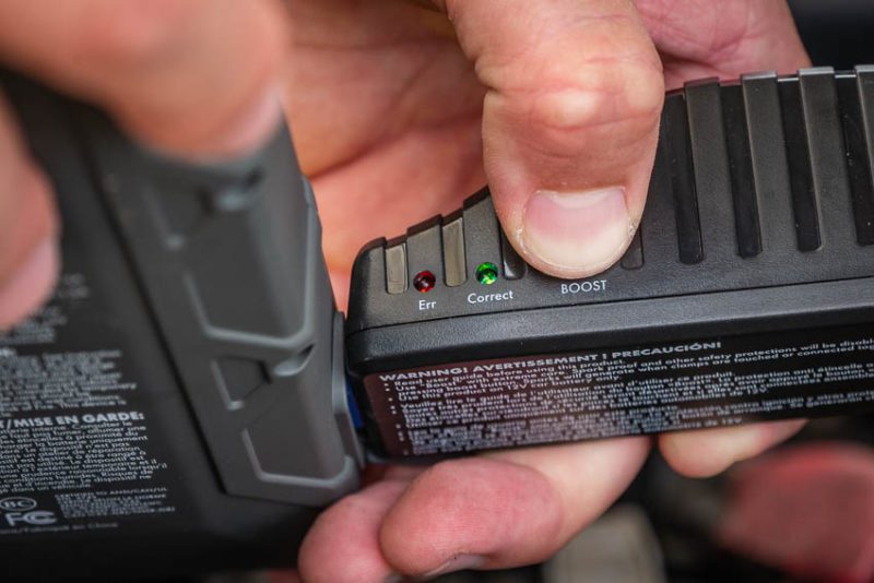 Basically, you’ll plug the cables into the side of the jump starter—and there’s only one way to do that so you won’t have to worry about accidentally reversing the polarity. Next, attach the alligator clamps to the corresponding colors on your battery terminals. A green status indicator light on the side of the cable connector lights up, letting you know that you can safely hit (or turn) the ignition on your car. After the engine starts, you simply disconnect the clamps from your battery and unplug the cables from the jump starter.
