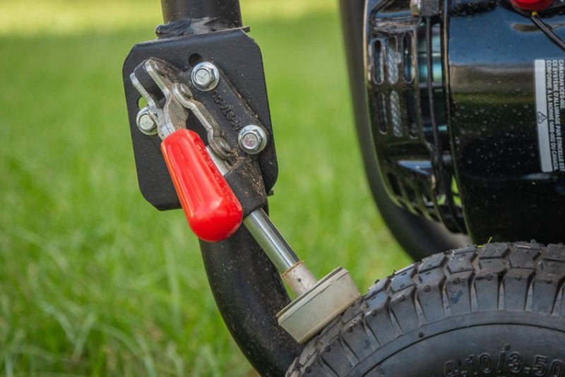One design element we were drawn to right out of the gate was the 4-wheel design of the frame. Itโs easier to roll on grass and soil than 2-wheel designs and less fatiguing over the course of a long day. Plus, the wider 10-inch pneumatic tires make bumps less jarring for the engine and pump sitting on the frame.