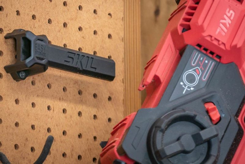 With the PWRCore 20 OPE line, Skil includes an Easy Storage Hook on the back of the tool and a bracket to hang it on. Just secure the bracket with two screws into the wall and you have a hanging solution thatโs much easier than using a keyhole.