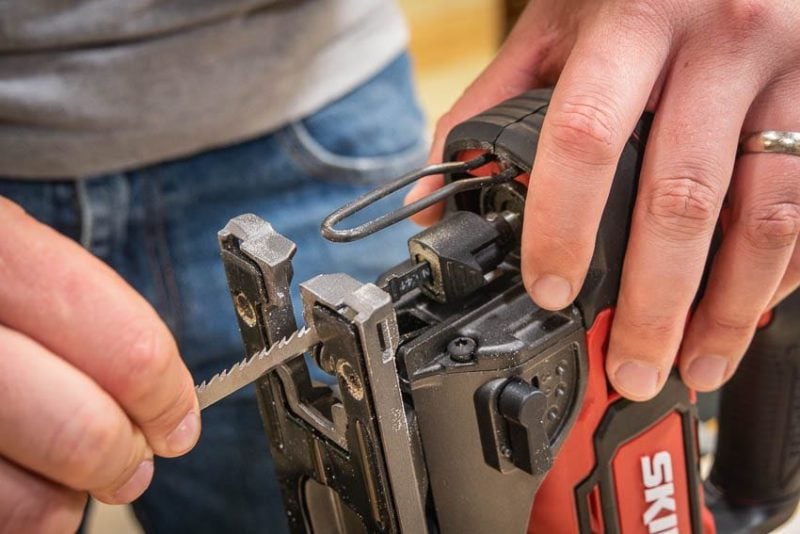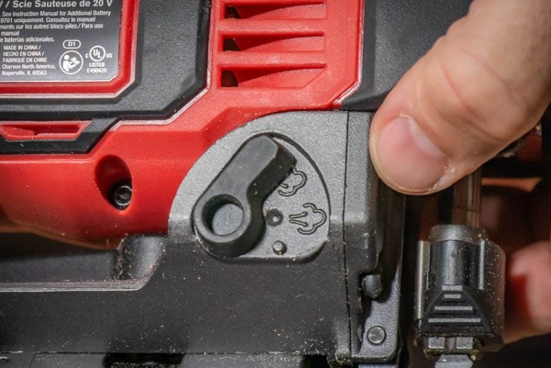 Skilโ€™s brushless jigsaw features three levels of orbital action which you adjust with a lever on the side. Higher levels of orbital action produce a more aggressive cut and trade off a bit on cut quality and precision along with an increase in tear-out.