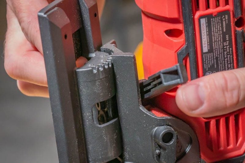 Personally, the tool-free bevel adjustment is one of my favorite design elements on this model. You see it on premium models frequently, but not every Prosumer or DIY jigsaw does. No need to find an Allen key, just loosen the lever located just above the shoe to bevel up to 45-degrees.