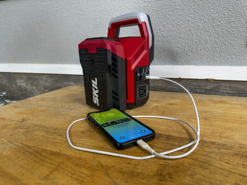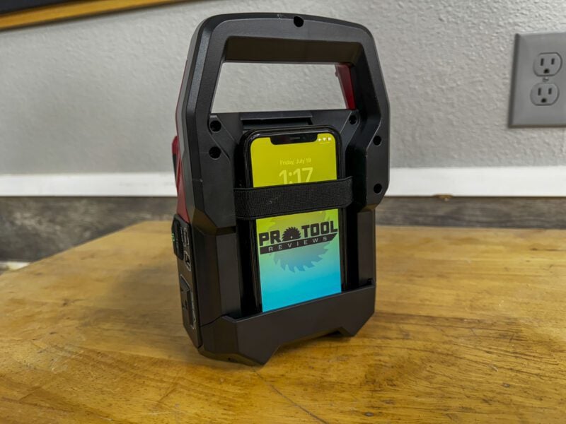 Also appreciated is the integrated phone stand on the back of the inverter. This lets you store your phone while you charge it to keep it safe while you work.