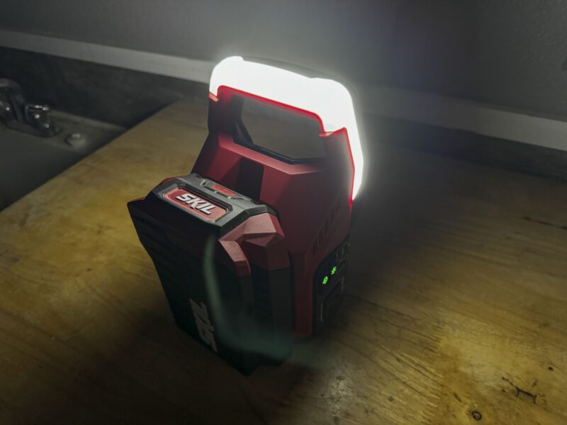 I like how Skil integrated an LED light into the carrying handle. The light has two brightness settings and has a white tone, giving you true color clarity. You can shuffle your brightness or power the light on/off using the light button on the control panel.