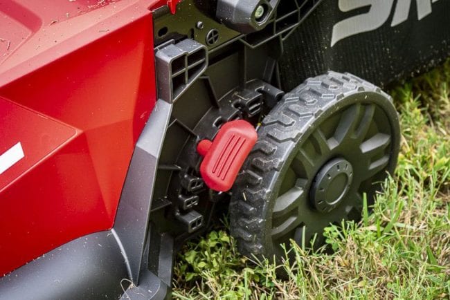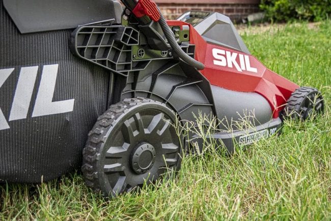 At one point in time, single-point height adjustments felt a little flimsy. Weโre starting to see that change a lot, and Skilโs 40V mower is another example of a sturdy single-point design.