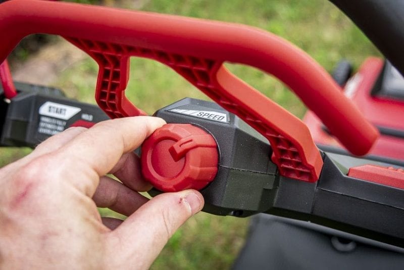 Like every other battery-powered mower on the market, the start-up is hassle-free. With the kitted 5.0Ah battery in its proper place, getting up and running is as simple as pushing a button, pulling back on the bale handle, and engaging the unorthodox-looking self-propel function.