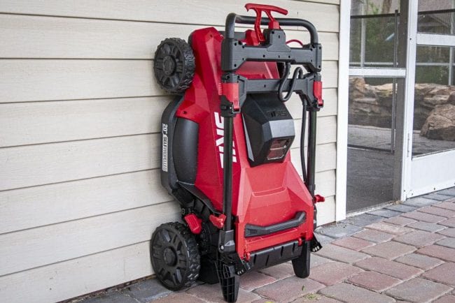 Storage is a breeze. With the handle slid in all the way, you can fold it over the mower for upright storage.