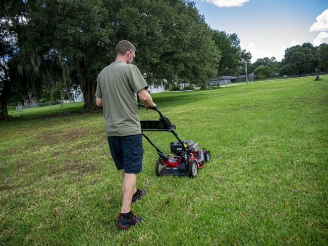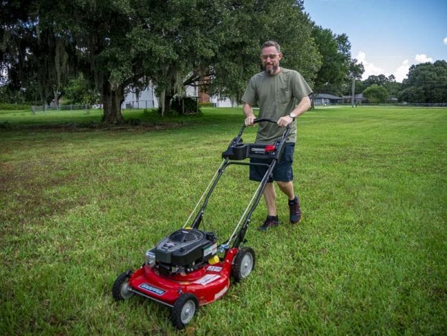 We threw this mower into our torture test, where we cut a straight line into 5 weeksโ worth of grass growth and walking at a consistent 2.5 MPH. When the mower quit, we measured the distance.