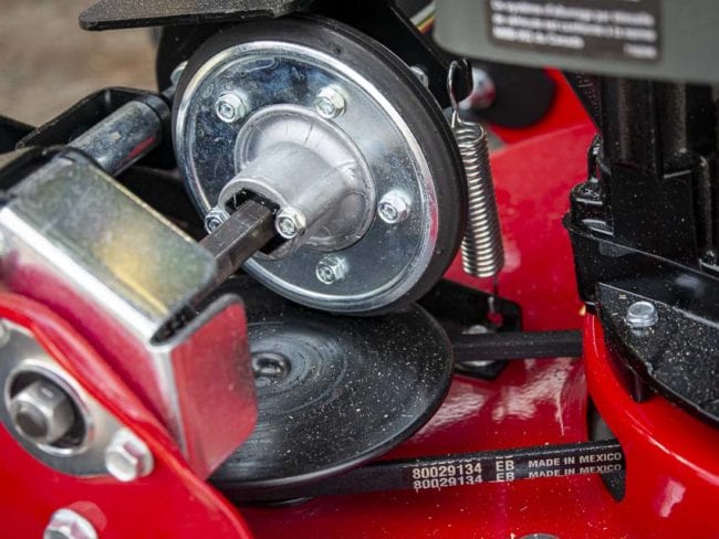The Snapper Commercial mower has a few interesting features about its drive train and allows for a variable walking speed up to 4 MPH. It functions by using a mechanical disc transmission. The disc slides left or right against the flywheelโfurther out to go faster or closer in to move slower.ย To set your pace, just adjust the lever on the left side.