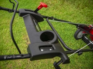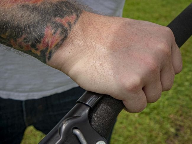 To engage the drive, thereโs another lever you need to hold down against the handle. It works and is comfortable enough, but there are a couple of downsides. First, you have to let it back up and re-engage it every time you stop the drive to turn. That wouldnโt be the case if it were front-wheel drive.