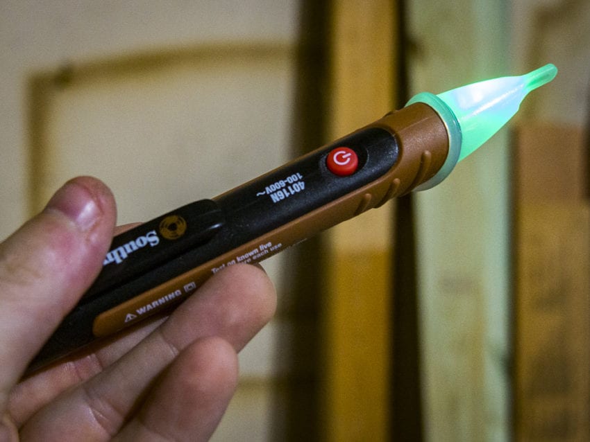 The Southwire Electricianโ€™s kit also includes the 40116N Non-Contact Voltage Tester. With a detection range between 100-600V AC, you shouldnโ€™t ever need to worry about having to jam anything into a live circuit. It has a flashlight on the non-business end, and it runs off of two included AAA batteries.