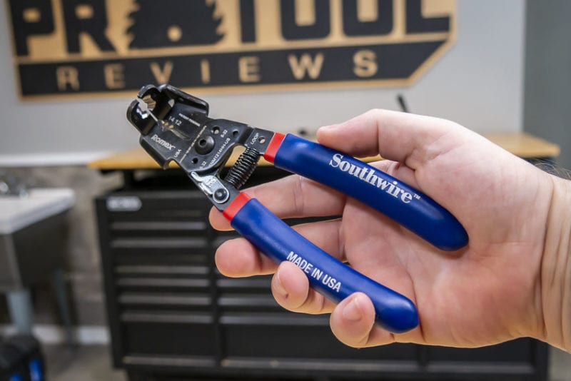 The Southwire Box Jaw Romex Stripper features a spring-loaded, ergonomic double-dipped handle. A thumb-lock keeps the whole package tight and compact when not in use.