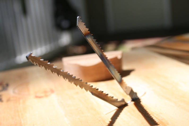 David: Well, the blades I typically use cost about $2.88 for a 3-pack and they get the job done, but for more detailed work or a smoother edge, the Spyder blades, even at $10 are pretty compelling. Itโs almost like you get a two-for-one deal, cutting and sanding. And you can really push the radius tight because the backside blade cleans your cut as you go. When I flipped over the wood, the bottom of the piece was absolutely pristine. If you can reverse-cut your wood upside down youโre going to have an almost flawless finish on that edge. These are nice blades, Iโll give them the old recommendation.