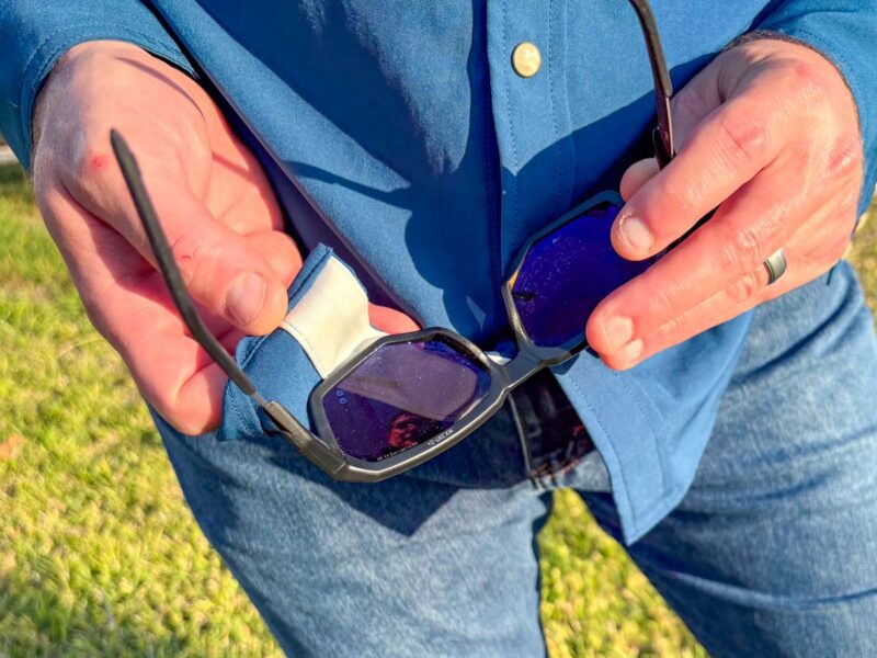 On the bottom right inside of the shirt, youโll notice a strip of material. This is for wiping off your glasses or sunglasses.