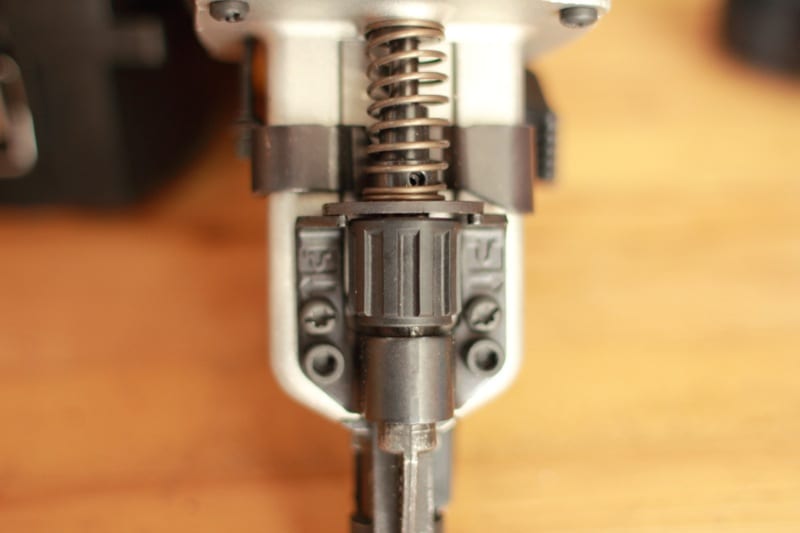 You select sequential or bump action on the side. The switch itself is actually pretty tough to move. While this should prevent accidental changing of modes, I felt like I might break it when I first flipped it. Iโ€™m hoping that it will get a little easier as I use it more. The other mode to choose is between motor speeds. Youโ€™ll find this hidden behind the rafter hook when it is tucked away. The lower speed is for 2โ€ณ โ€“ 3โ€ณ nails, while 3-1/4โ€ณ to 3-1/2โ€ณ should be fired in the higher speed mode. Using the lower speed on the smaller nails should improve efficiency for the battery. However, itโ€™s certainly able to fire them in high-speed mode should you need more power in harder materials.