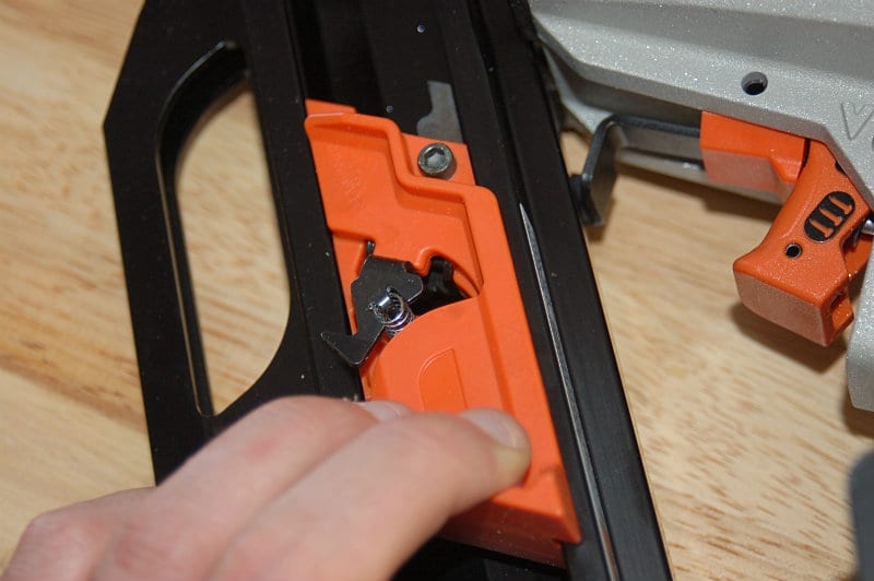 While the Paslode F325R can be switched between bump and sequential fire, itโs not a tool free operation. You need to pop out the pin and o-ring to reverse the trigger. Having been spoiled by the simple flipping of a switch on DeWaltโs 20V Max Framing Nailer, Iโd prefer not to see the more complex adjustment. Paslodeโs Compact Framing Nailer is packaged in sequential fire mode.