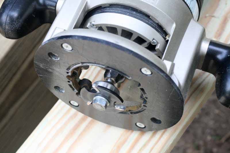 In our use, the Tiger Claw Slot Cutter didnโt quite fit in such a way that it would work on boards laid directly on the joists (without first removing them to a bench), so we flipped the bit around to place the bearing on top and ground down the tip of the bolt with an angle grinder to make the system more flush. This gave us the flexibility to line up the boards and use the router without relocating them.