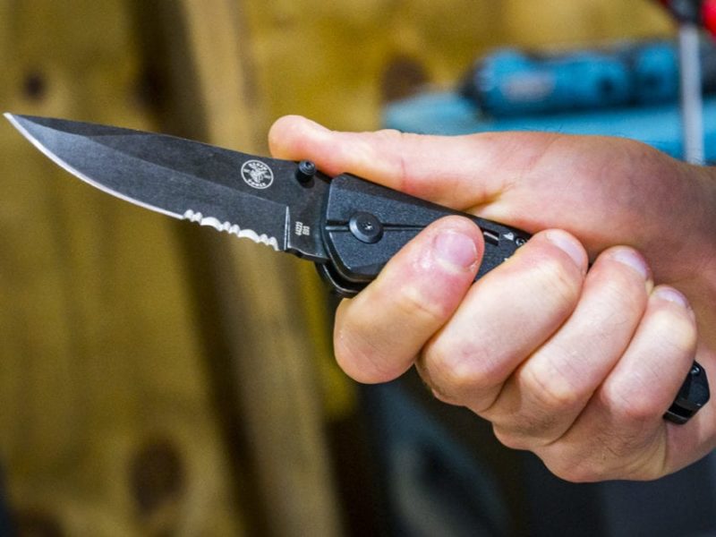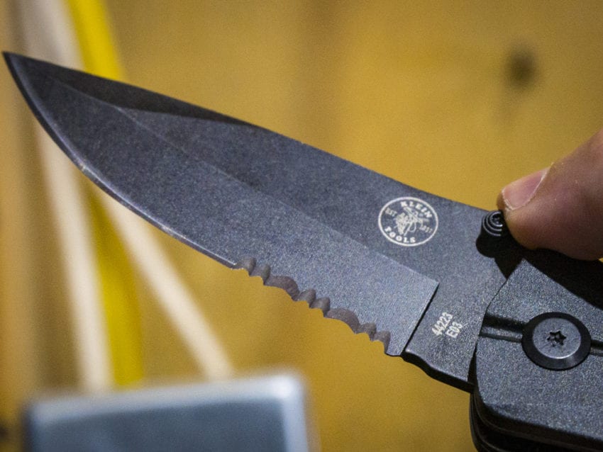 Like it or not, this Klein spring-assisted pocket knife goes for a partially serrated edge. It gives you some rope/cord cutting ability, but most guys prefer the edge to be fully plain or serrated, not half and half.