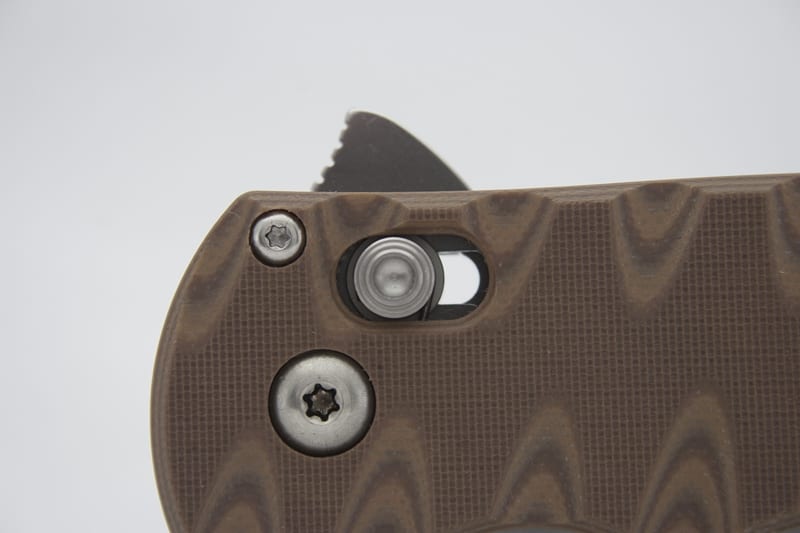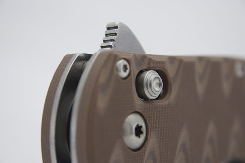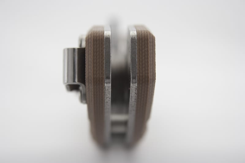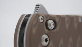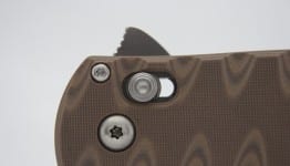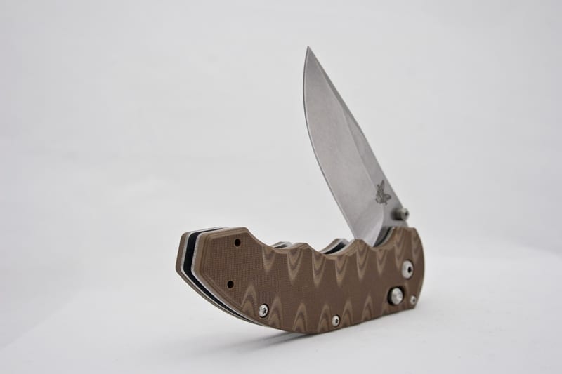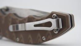 The desert sand G10 handle provides excellent grip, comfort, strength, and durability. G10 scales are very popular among high-end knives because they are incredibly strong and durable. Add to that strength and its thickness (0.59 inches), and you have a knife that fills the hand in a way that gives you maximum command of the blade. There is nothing worse than carrying a knife that slips around. With the Benchmade 300SN AXIS Flipper, the G10 scales allow none of that. Benchmade also carved the grip into the knife handle, which resulted in a gnarly tiger stripe-looking pattern. These are actually grooves that are cut right into the sandwiched layers of the handle. From an aesthetic point of view, these grooves look pretty cool, but in terms of functionality, I didnโt find them to be significantly useful to either the grip or the feel.