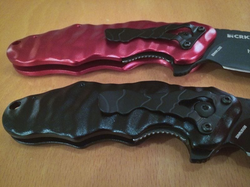 But like most knives, this one does have a flaw.ย The Aluminum handles, although lightweight, and really cool looking, are too slick for my liking.ย It pains me to say such a thing because everything else about the handle is terrific.ย Both sizes fit well in the hand, are easy to open, and are comfortable in the pocket.ย But the slick handle is a feature that must be corrected.ย I live in Florida, and surpriseโฆ it gets hot in the summer.ย Sweaty hand plus slick knife is a dangerous combination.