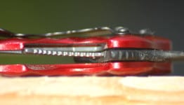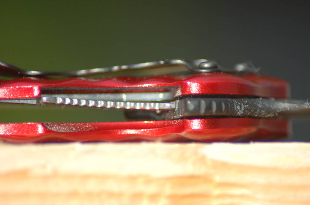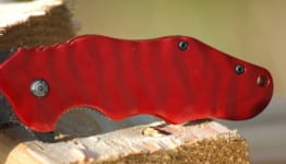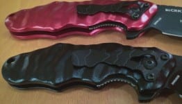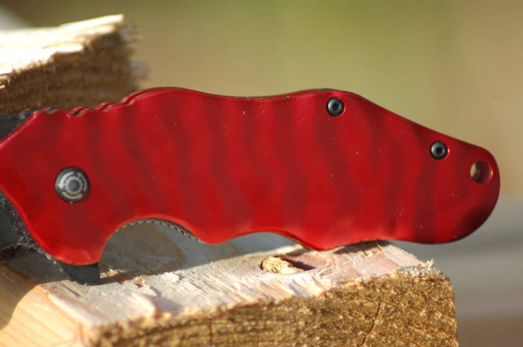 The Wrinkle is a liner lock for those who want to be able to close the knife with one hand โ mighty useful I might add.ย The handles are made of cold forged 6061T6 Aluminum handles.ย The larger (SE74) Wrinkle comes in 4 color choices and 8 for the smaller (SE67) version. Of the two knives I received, the larger came with the red handle and the smaller with black.ย Both look aesthetically pleasing for sure (I think I like the black on black but I often get a kick out of the red handle as well).ย The handles are really strong, but they are also light.ย I am impressed with the balance of the knife and can feel a proportional difference given the blade is slightly heavier.ย The handles are slick but to compensate, they are ridged to create grip.ย This also gives the appearance of a stunning, tiger stripe look to the handle.