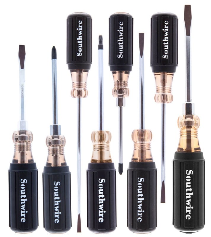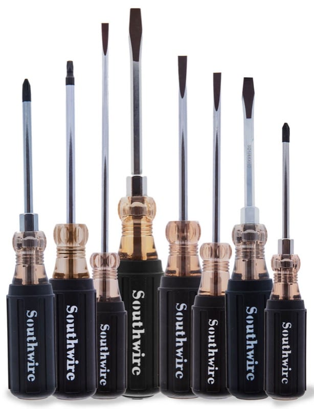 The Southwire 8-piece screwdriver setย includes eight different drivers. There are three slotted โcabinetโ screwdrivers, two keystone slotted screwdrivers, two #2 Philips drivers, and a square (โRobertsโ style) driver. While screwdrivers may not seem like an exciting toolย to review (and indeed, for the mostย partย they arenโt) there are some things to know about a tool youโre going to spend an awful lot of time using if youโre an electrician or do other MRO work.