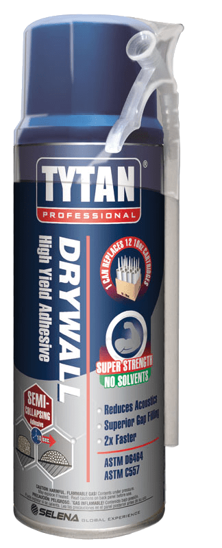 โTytan Drywall High Yield Adhesiveโs high yield formula means that one 12 oz can does the work of a case of 10 oz cartridges. We estimate that about three 20 oz cans of Tytan Drywall High Yield will bond and seal every piece of drywall in an average basement room remodel. It is also the best adhesive to bond and seal exterior sheathing panels for a shed, garage, or pole barn, and will help to insulate and seal out pests.โ