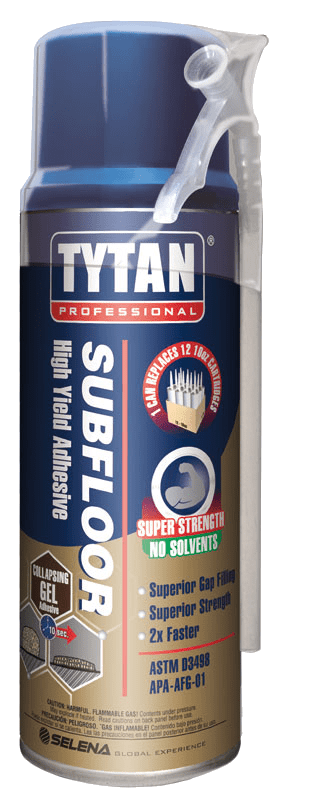 Tytan Subfloor High Yield Adhesive features collapsing gel technology that provides superior yield, maximum strength, and gap filling on horizontal applications. This adhesive worksย by filling the gap instead of simply trying to bond the materials, reducing the nail movement that leads to squeaks. Tytan Subfloor adhesive can be applied to dry, wet, or frozen surfaces. It comes in 12 oz and 20 oz Straw Subfloor High Yield Adhesive cans. Tytan also offers a 29 oz gun applicator that claims to deliverย superior yield, reusability, and precision to make the job easier and faster.